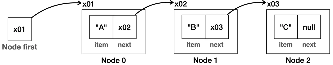 링크드 리스트에 A -> B -> C 순서로 저장한 경우의 개념도